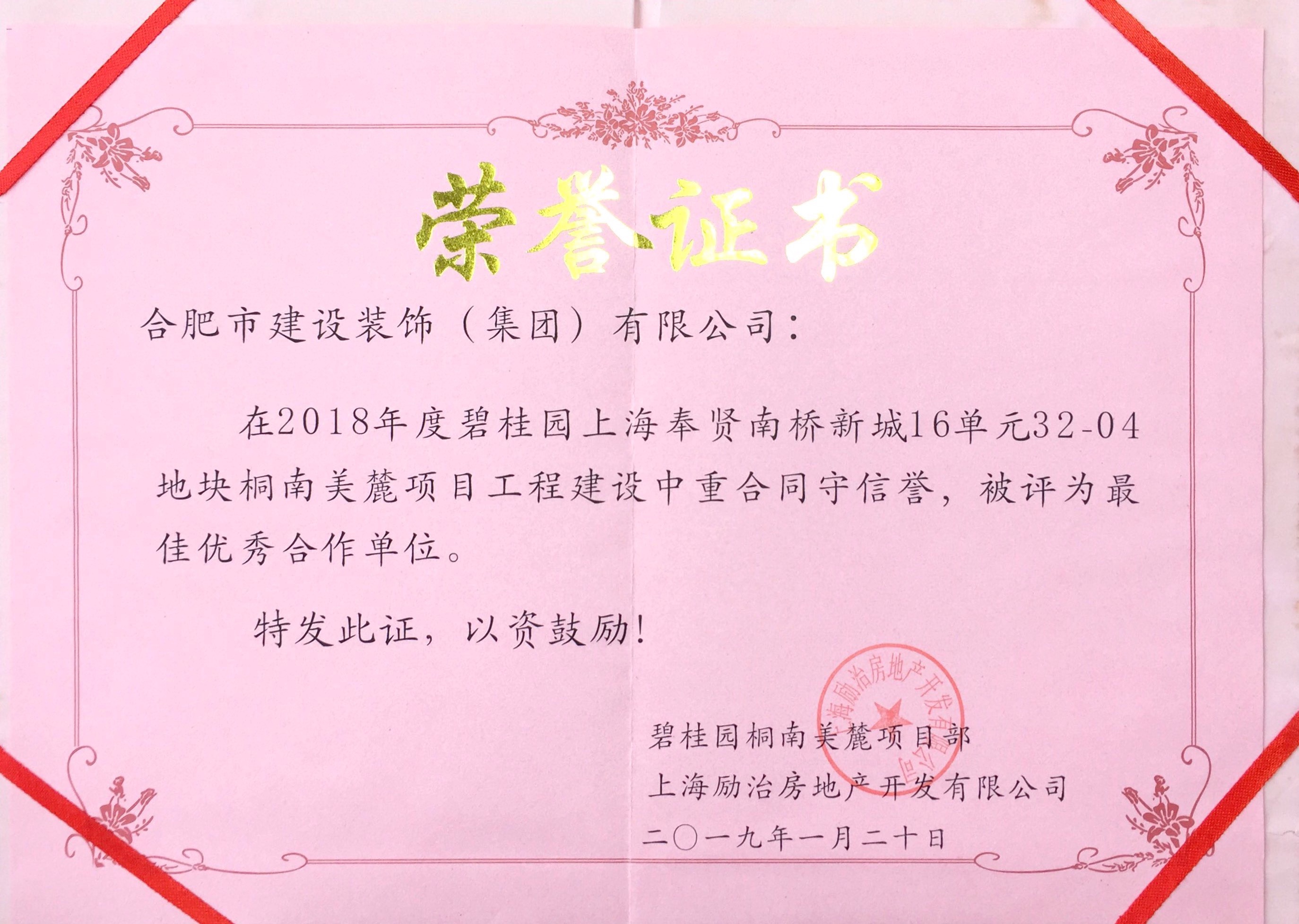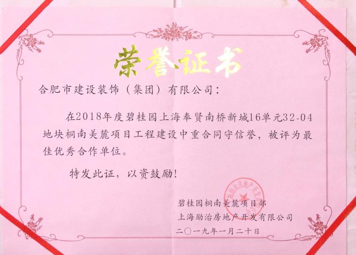 >2018年度碧桂园上海奉贤南桥新城16单元32-04地块桐南美麓项目工程建设者重合同守信誉,,,,,,,被评为最佳优秀合作单位