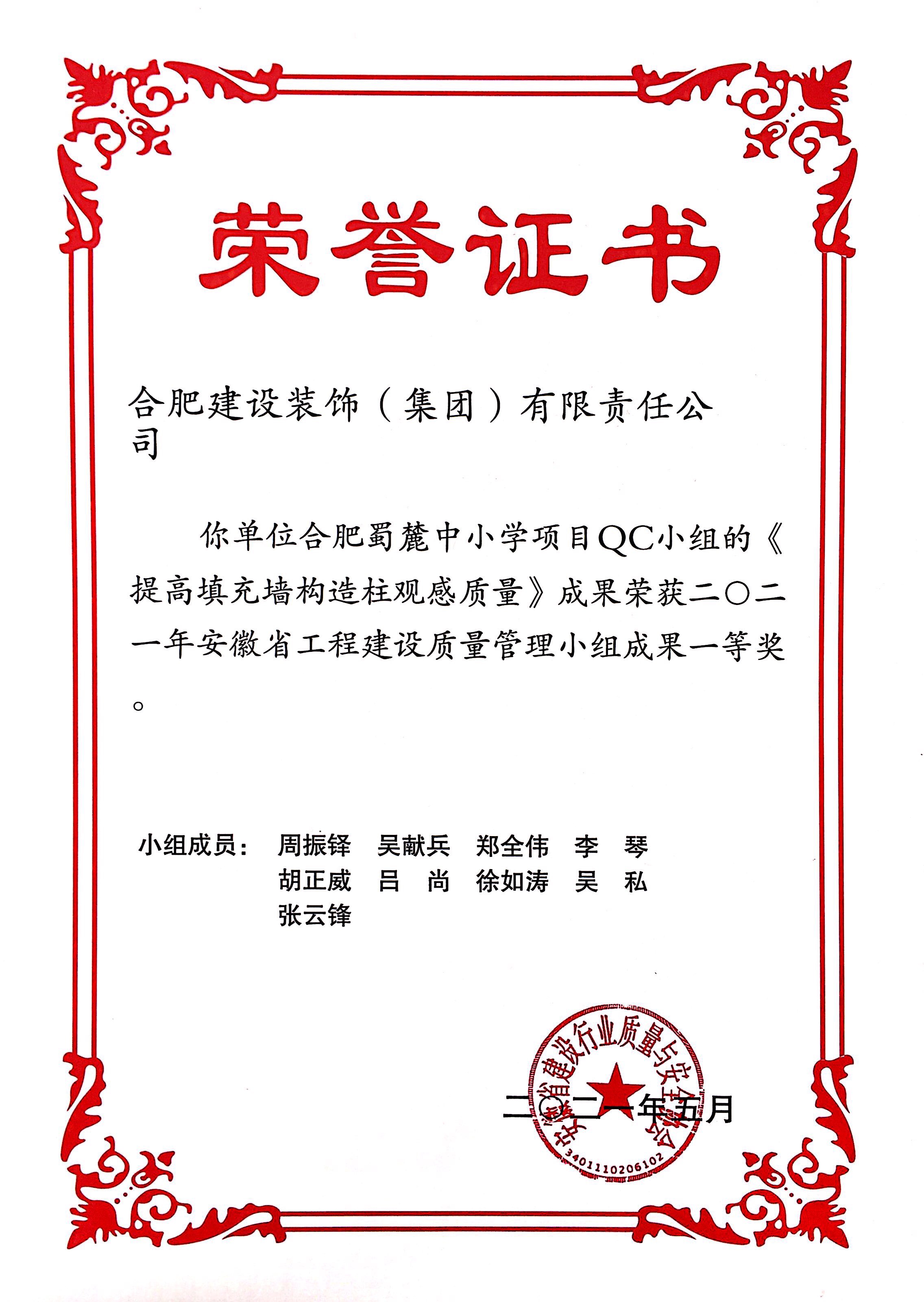 >合肥蜀麓中小学项目QC小组《提高填充墙充构造柱观感质量》——2021年安徽省工程建设质量管理小组一等奖